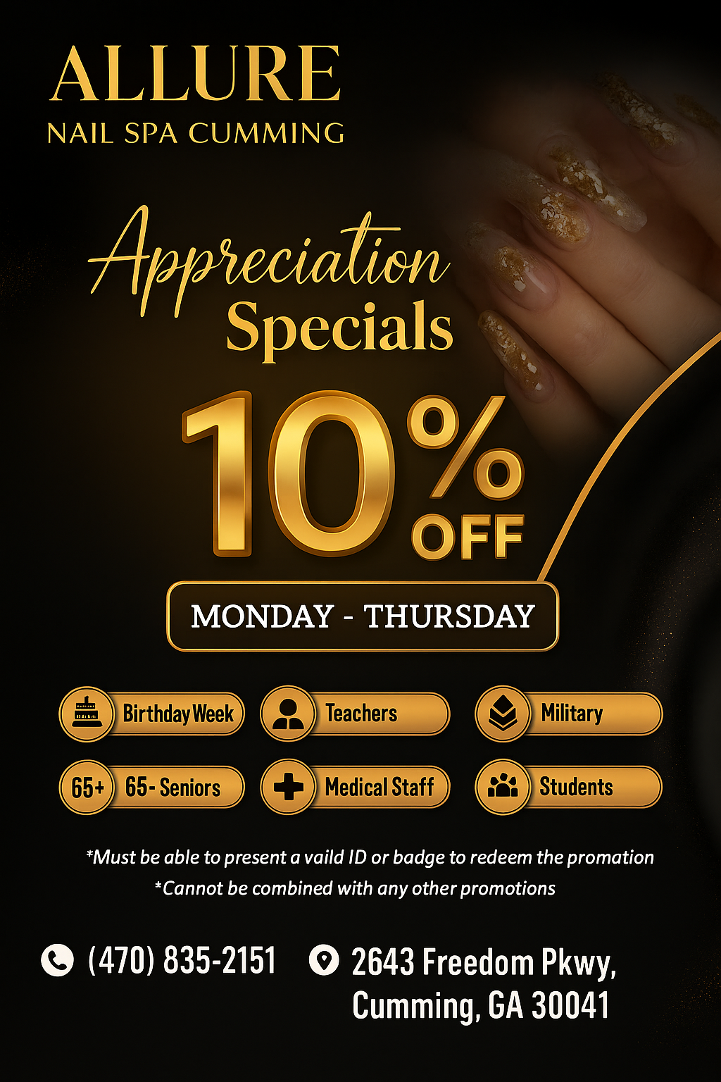 Come and experience our exceptional services at Allure Nail Spa Cumming . Gift Certificate Available- Appointment & Walk-ins Welcome!