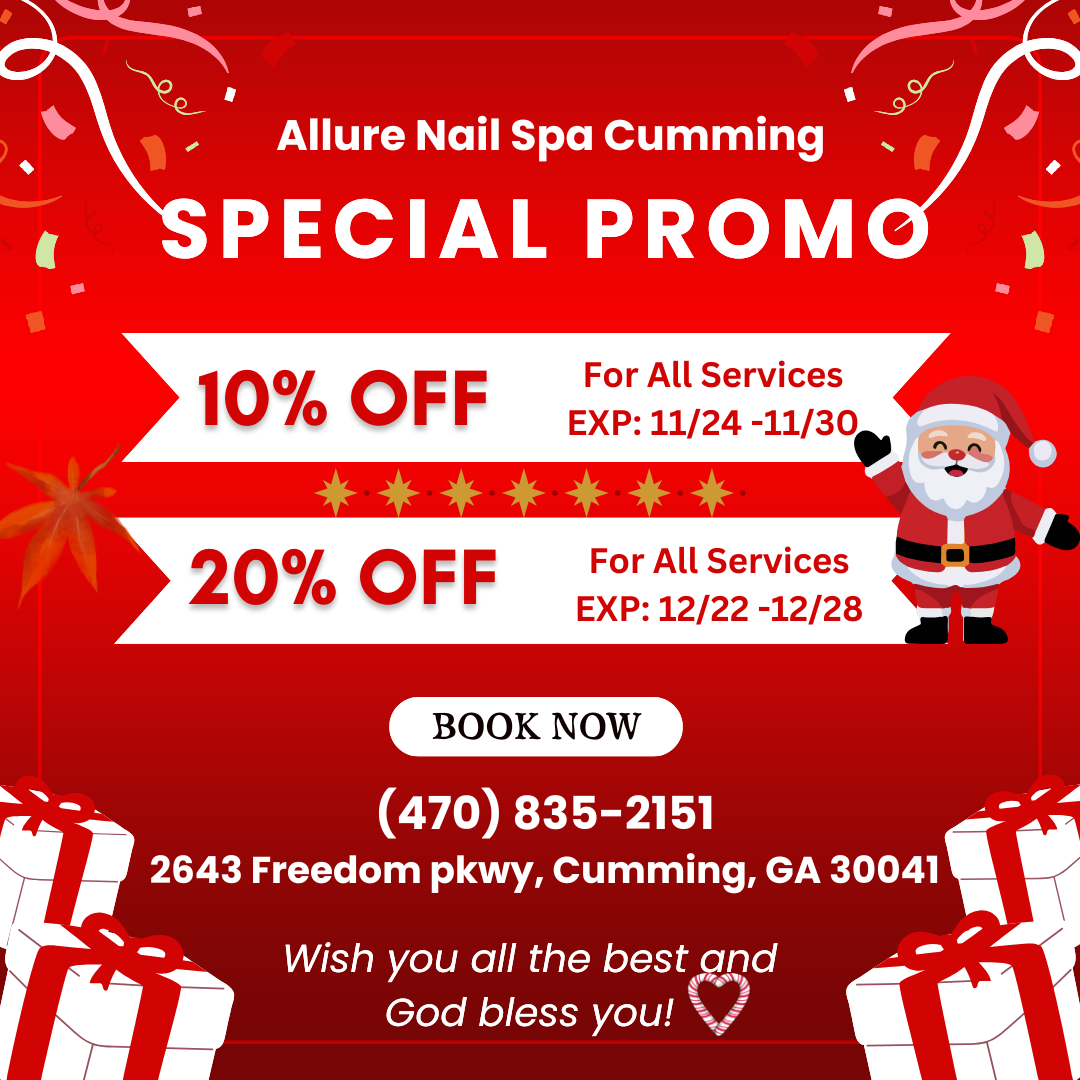 Come and experience our exceptional services at Allure Nail Spa Cumming . Gift Certificate Available- Appointment & Walk-ins Welcome!